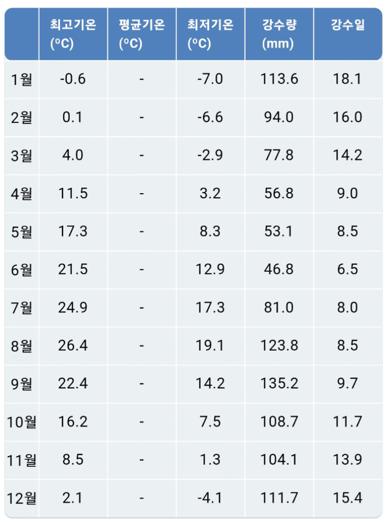 - 8월부터 4월까지 강수량과 강수일이 비교적 고르게 분포하고 있으며 강수량의 연중 최고치는 9월 135.2mm, 강수일은 1월 18.1일입니다.