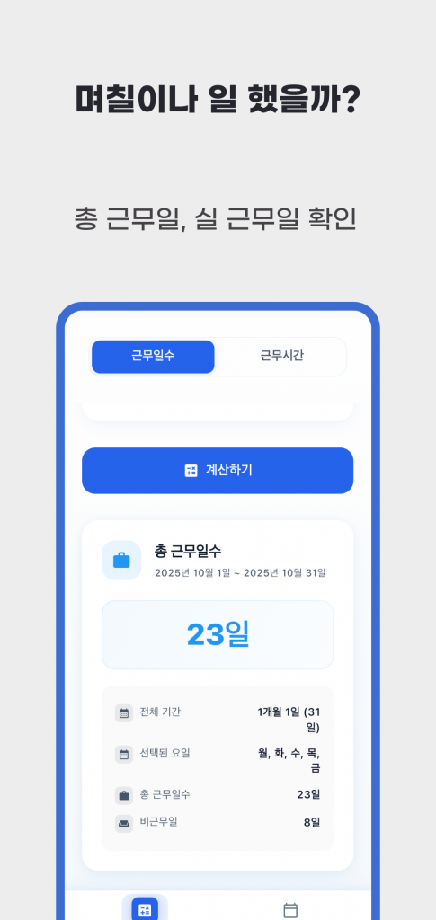 프로젝트 기간이나 특정 요일에만 근무하는 분들에게 근무일수 계산은 은근히 번거로운 일입니다. 저희 근로시간 계산기 앱은 시작일과 종료일을 설정하고, 근무할 요일을 선택하기만 하면 총 근무일수를 즉시 계산해 줍니다.