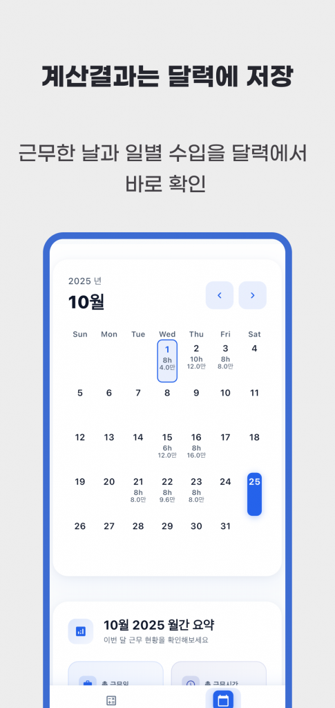 근로시간 계산기의 가장 강력한 기능은 바로 ‘달력 기록’입니다. 모든 계산 결과는 터치 한 번으로 달력에 저장할 수 있습니다. 이렇게 저장된 기록들은 나만의 ‘급여 달력’이 되어 매일의 근무 현황과 수입을 한눈에 파악하게 해줍니다.