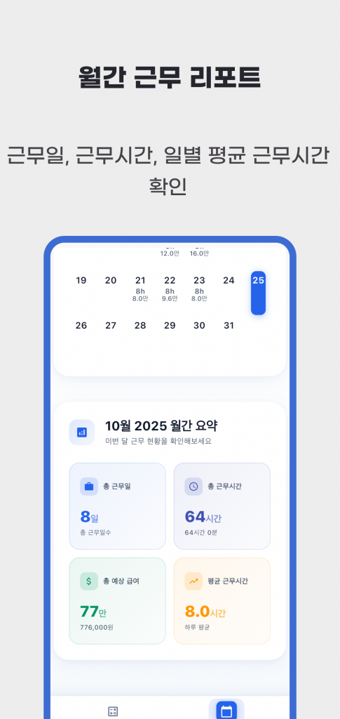 • 투명한 관리: 나의 모든 근무 기록과 예상 수입을 한눈에 관리하여 동기를 부여합니다.