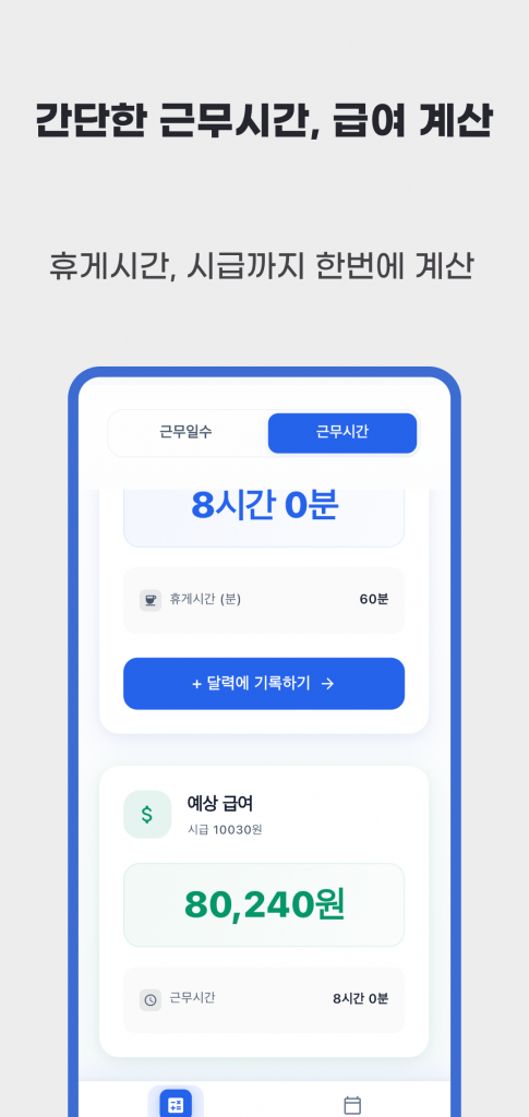 • All-in-One: 근무일수, 근무시간, 시급, 급여 계산, 달력 기록까지 앱 하나로 해결!