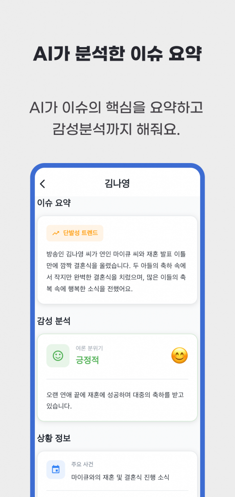 “그래서 이게 왜 화제인데?” 궁금증을 바로 해결해주는 AI 핵심 요약을 제공해요. 2~3 문장으로 정리된 요약만 읽어도 트렌드의 중심 내용을 빠르게 파악할 수 있죠. 더 나아가, 이 이슈에 대한 사람들의 반응이 어떤지 ‘긍정적’, ‘부정적’, ‘중립적’으로 알려주는 감성 분석과 그 이유까지 친절하게 설명해준답니다.