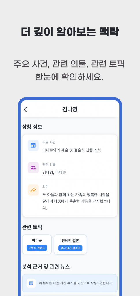 단순 요약을 넘어, 이슈의 맥락을 구조적으로 이해할 수 있도록 도와줘요. ‘무슨 일이 있었는지(Event)’, ‘누가 관련되었는지(People)’, ‘왜 중요한지(Significance)’로 정보를 구조화하여 보여주죠. 덕분에 키워드를 둘러싼 배경과 중요성을 훨씬 깊이 있게 이해할 수 있습니다.
