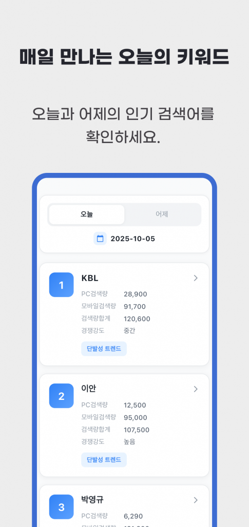 단순히 키워드만 나열하는 것이 아니라, 검색량이 보기 쉽게 정리되어 있어 어떤 키워드가 지금 가장 많은 관심을 받는지 한눈에 파악할 수 있답니다.