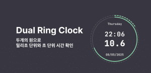 Circular ms Clock 밀리초 단위와 초 단위 시간을 동시에 확인할 수 있는 디지털 시계 앱을 소개드려요. 밀리초 시계와 초 단위 시계를 직관적인 이중 원형 그래픽 디자인으로 보여주는 것이 특징이에요. 주요 기능과 장점 이중 원형 시계 밀리초와 초 단위 시간을 두개의 원으로 동시에 확인할 수 있어요. 마지막 5초 강조 1분이 되기 전 마지막 5초는 다른 색으로 … 밀리초, 초 단위 시간 동시 확인 디지털 시계 계속 읽기