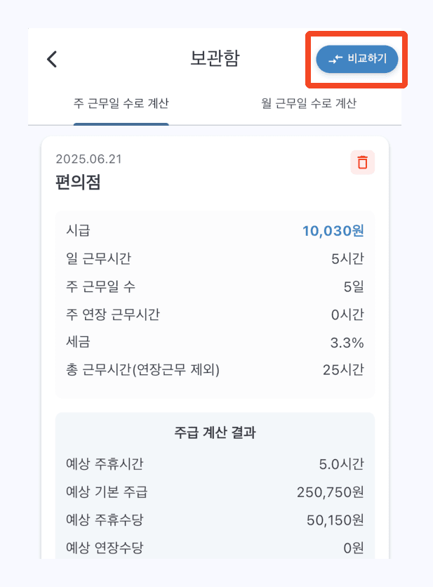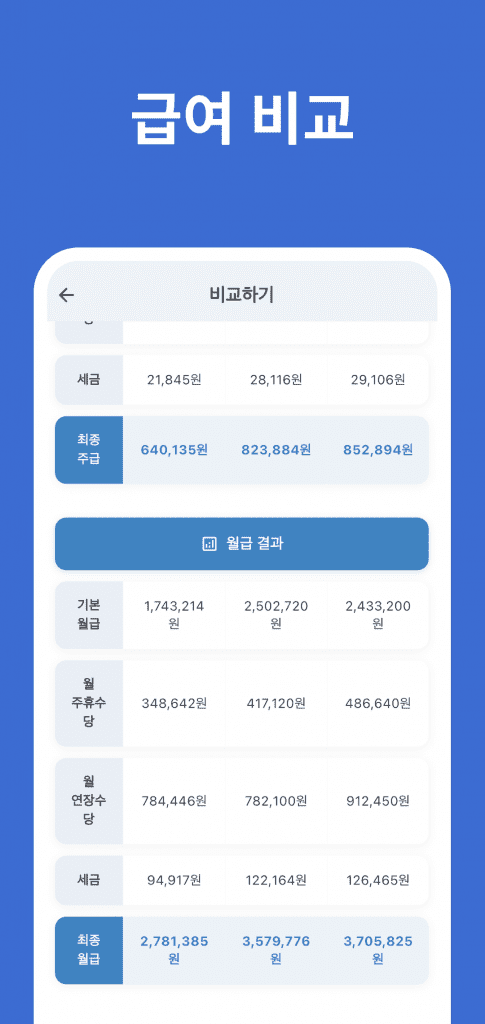 저장된 계산 결과로 급여를 비교할 수 있습니다.