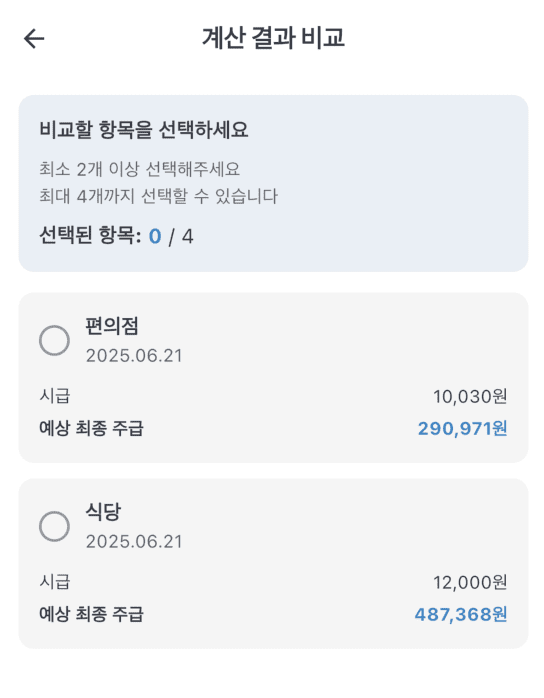 최대 4개까지 급여 계산 결과를 한눈에 확인 할 수 있습니다.