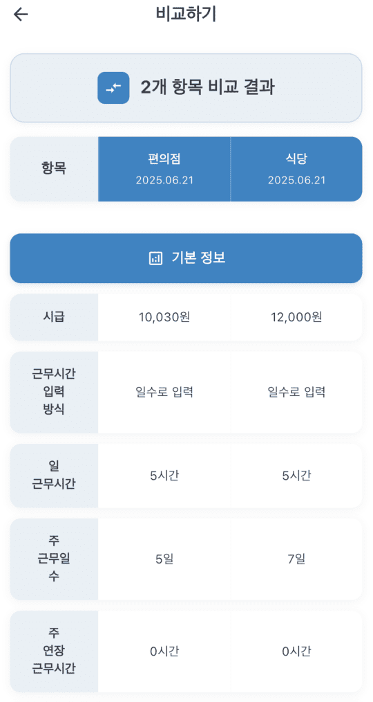 시급계산기 1.3.0 버전에 급여 비교 화면이 추가되었습니다.