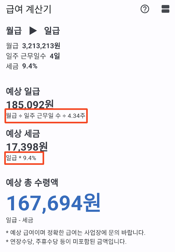 먼저 급여를 계산할 때 사용되는 수식을 바로 확인할 수 있도록 계산 결과에 해당 수식을 함께 제공하도록 했습니다.