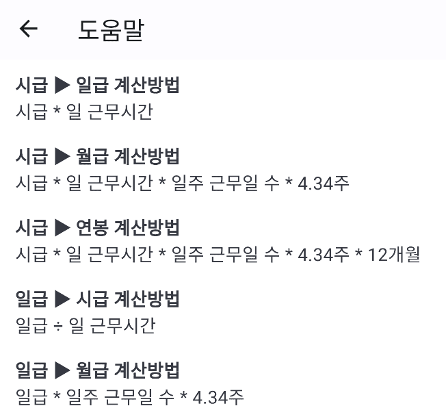 도움말에서는 각 급여 형태에 다른 모든 계산 방법들이 자세히 설명되어 있어서 언제든지 확인하실 수 있습니다.
