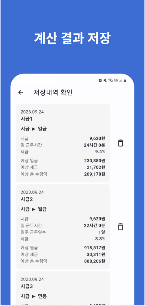 계산 결과를 기록하고 다시 확인할 수 있습니다. 주기적인 기록으로 과거의 급여를 상기할 수 있습니다.