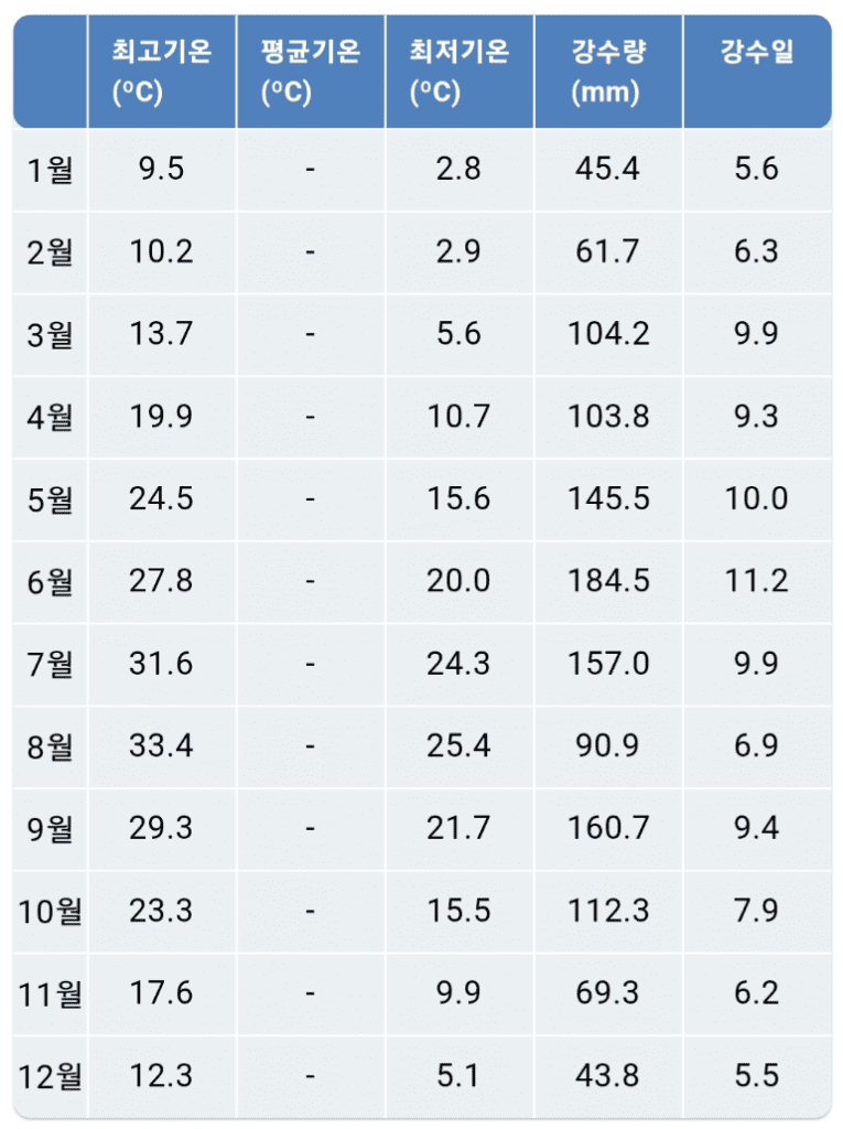 - 강수량과 강수일은 6월이 각각 184.5mm, 11.2일로 연중 최고치입니다.