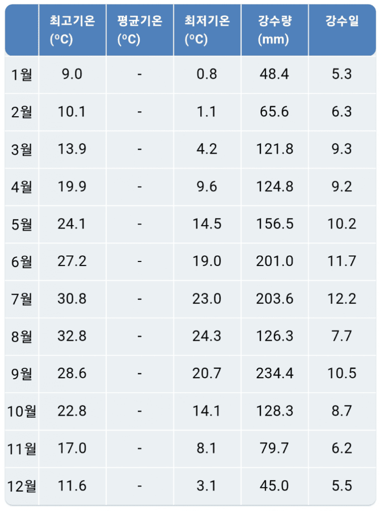 - 강수량은 3월부터 10월까지 대체로 골고루 분포하고 있으며 9월이 피크입니다.