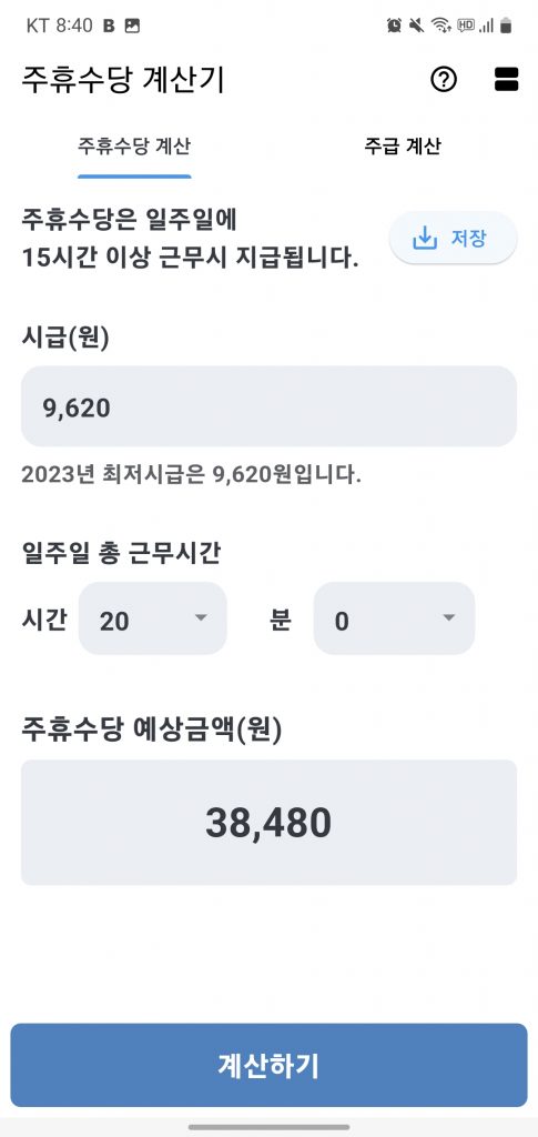 위의 주휴수당 계산은 주휴수당 계산기 어플을 이용했습니다.