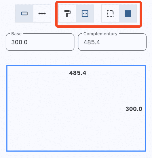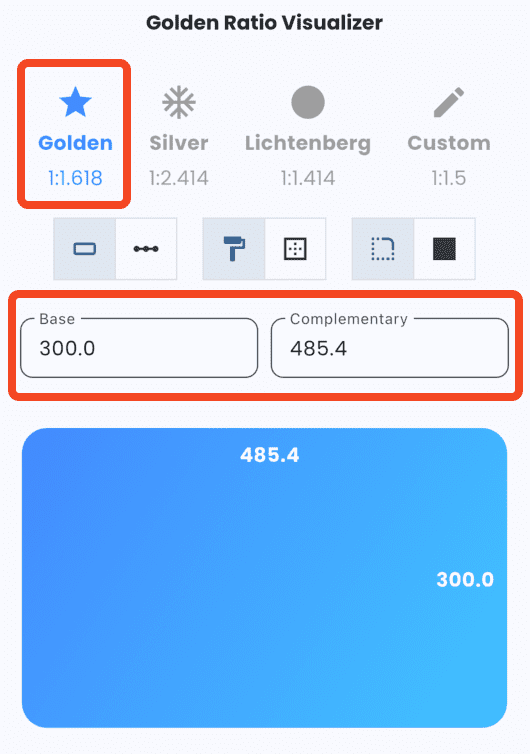 Golden 버튼을 선택하고 Base에 세로, Complementray에 세로값을 입력하면 아래 사각형이 바로 그려져요.