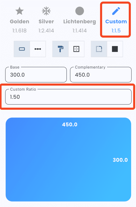 Custom 버튼을 선택하면 황금비율이 아닌 내가 직접 설정한 비율로 사각형을 그릴 수 있어요.