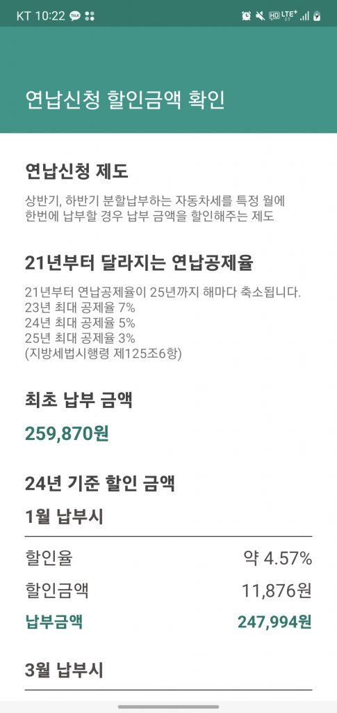 안드로이드의 경우 자동차세 계산기를 이용하면 연납할인된 금액을 손쉽게 확인할 수 있습니다. 이외에도 향후 10년 자동차세 등도 확인하실 수 있습니다.