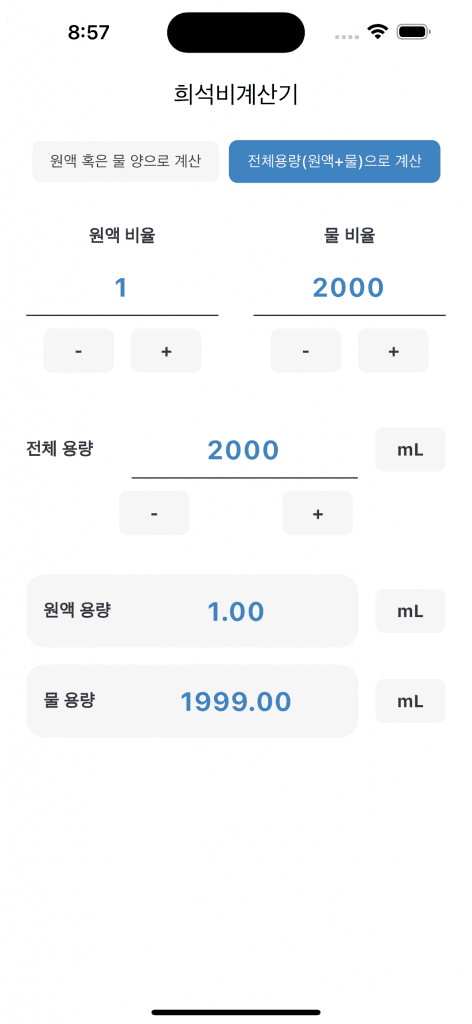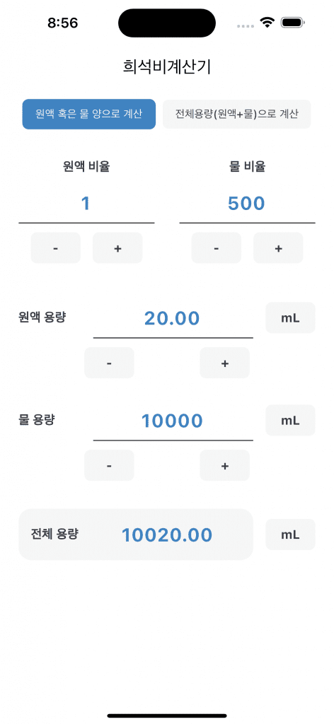 - 앱에서 ‘원액 혹은 물의 양으로 계산’ 선택